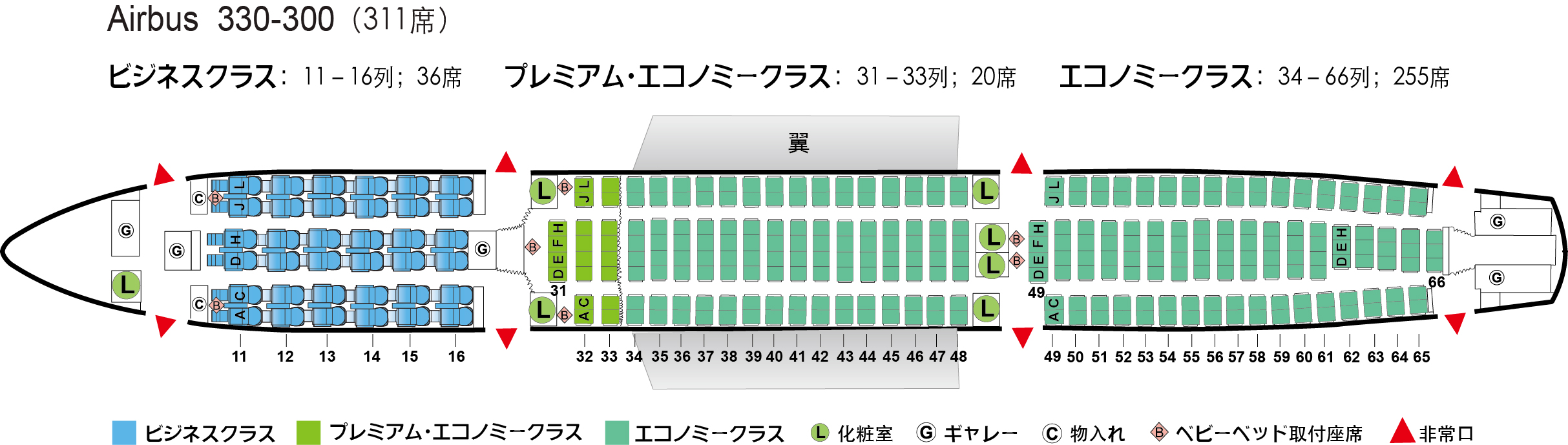 | 総座席数 | ビジネスクラス | プレミアムエコノミークラス | エコノミークラス |